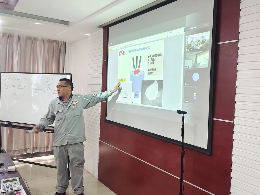 培訓(xùn)現(xiàn)場(chǎng)座無虛席,研發(fā)部工程師馬力、研發(fā)部部長(zhǎng)李宗輝分別就熔制技術(shù)基礎(chǔ)知識(shí)、石英坩堝制造的核心技術(shù)等內(nèi)容以深入淺出的形式悉數(shù)傳授,得到與會(huì)人員一致好評(píng)。